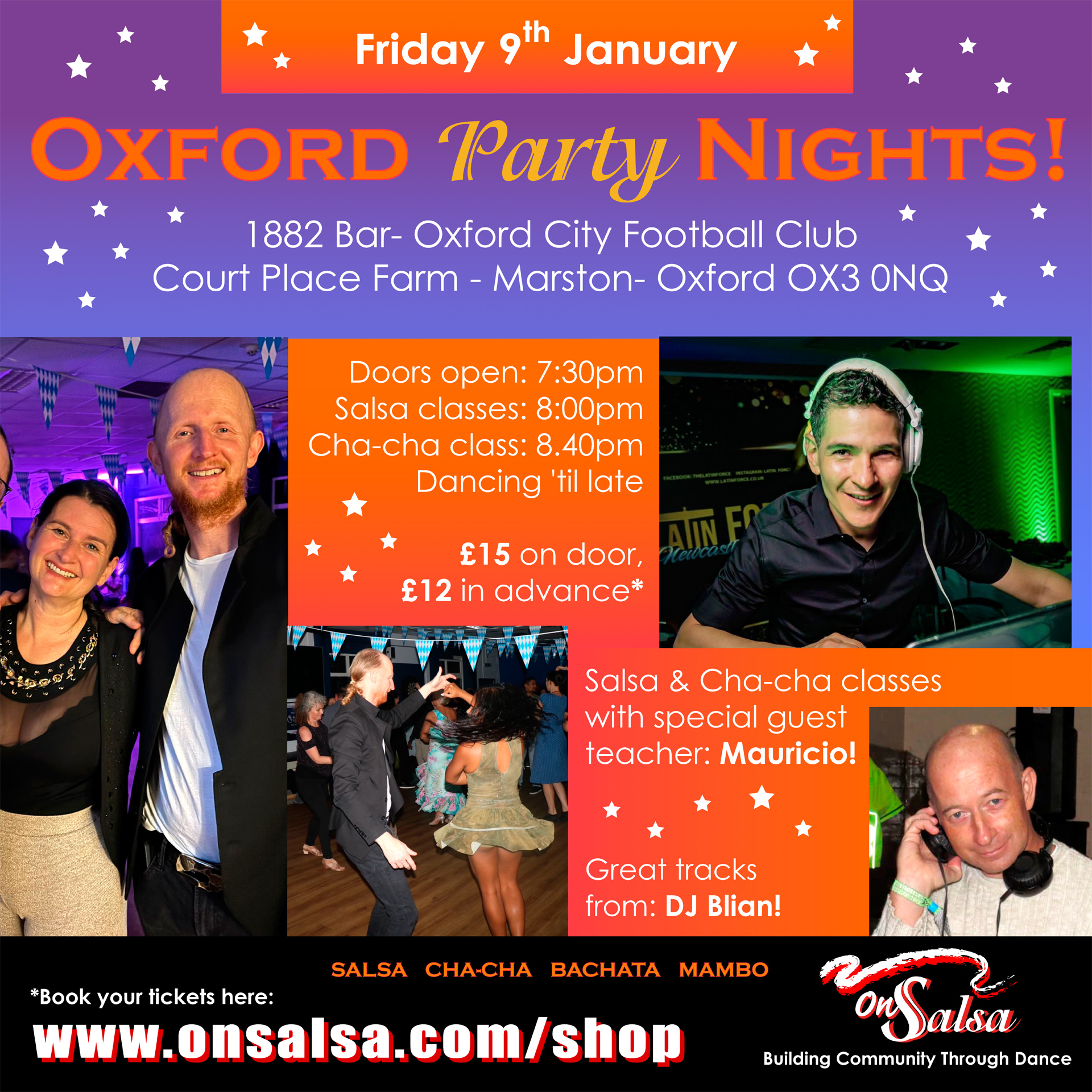 We host monthly salsa parties in Oxford – with classes, fun and lots of dancing. Our venue is Oxford City FC, Bar 1882, Court Place Farm, OX3 0NQ. 8pm starts until late.